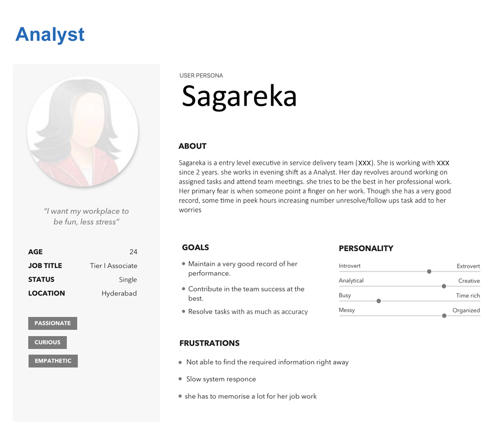 We have chosen few users randomly from various teams and tried to understand the actual problems of users relating to tasks, work allocation, Nature of task they are doing and Daily, Weekly and monthly report of the associates. Personas created to gather the requirements and pain areas of users who are fallowing the current process to eloborate in detail.